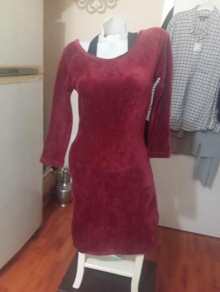 Bordo süet kumaştan, fitted kesim midi uzunlukta, uzun kollu ve drapeli V yakalı bohem tarzda kadın triko elbise. Günlük kullanıma uygun rahat bir model.