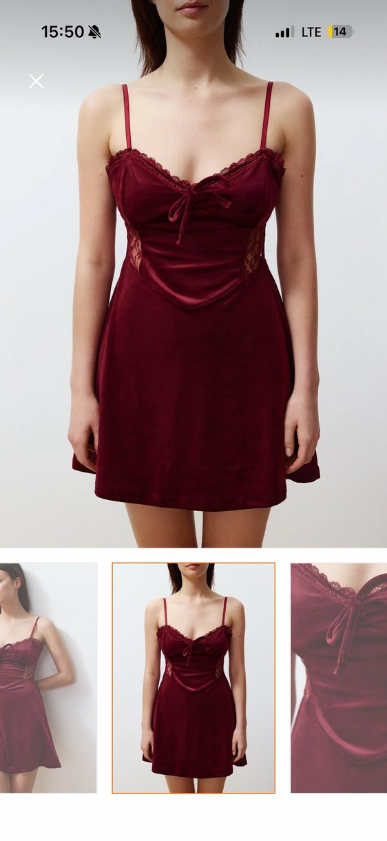 Bordo renkli, süet kumaştan yapılmış, dantelli ve V yakalı, ince askılı, dar kesim mini elbise. Gotik tarzda, romantik akşamlar için uygun. birkaç kere giyildi sadece