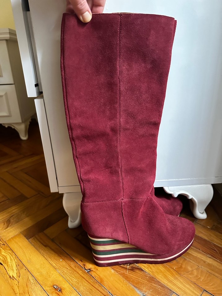 38 Bordo renkte, yumuşak süet malzemeden yapılmış, dolgu topuklu içi deri diz boyu çizme ürün tertemiz sorunsuz
