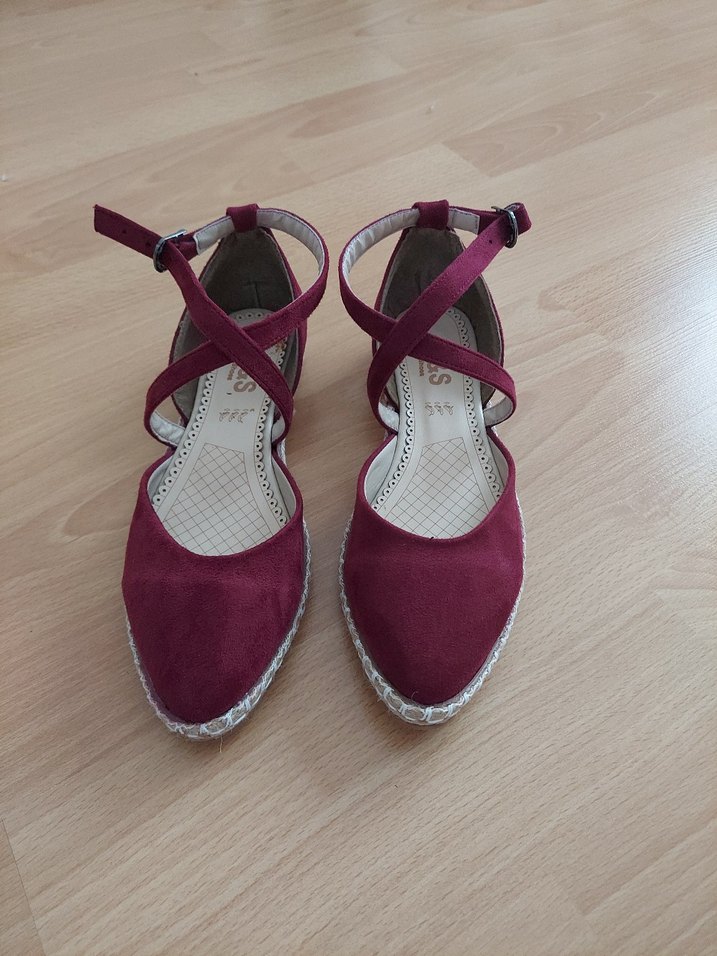 Bordo süet, parlak görünümlü dolgu topuklu espadril, tokalı kayışlarla desteklenmiş. Günlük kullanım için uygundur.