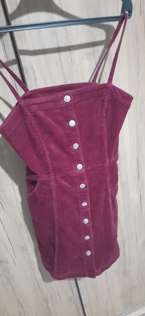 Düğmeli, straplez yakalı bordo süet elbise, vintage tarzıyla günlük kullanıma uygun ve vücuda oturan model.