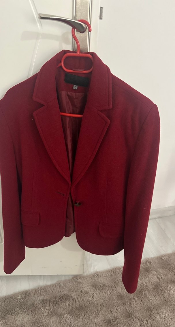 Bordo süet kumaştan, düğmeli, kesik yaka ve uzun kollu kadın blazer ceket. Normal uzunlukta ve rahat kesim, ofis ve günlük stil için uygundur.