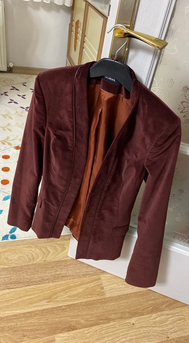 Bordo süet kumaştan, düğmeli ve normal boyda kadın blazer ceket. Notch yaka ve uzun kollu, ofis ve günlük şıklık için ideal.