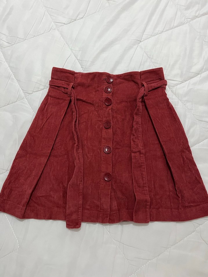 Bordo süet kumaştan yapılmış, düğmeli ve bol kesim kadın eteği. Bohem tarzı ve yumuşak dokusu ile dikkat çeker.