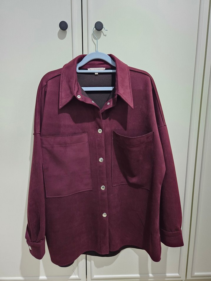 Bordo süet kumaştan, notalı yaka ve uzun kollu, düğmeli, salaş kesim kadın gömlek. İki büyük ön cepli, günlük rahat kullanım için uygun. Sateen marka 38 beden fakat oversize. 40 bedene bile cok rahat olur. 42 bile olabilir. Cok sık bir duruşu var. Giydikten sonra cok buyuk durdugunu dusundugum icin satmaya karar verdim. Cok az kullanıldı. internette fiyatı 1.149 tl