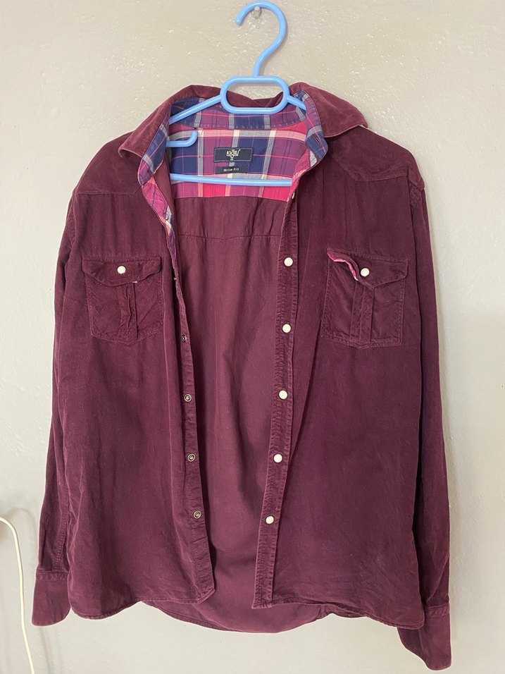 Bordo renkli erkek gömlek, düğmeli ön, uzun kollu ve kesik yaka detayına sahip. Yumuşak süet kumaştan, gevşek kesim ve günlük sokak stiline uygun. Normal midi boyda, desensiz.