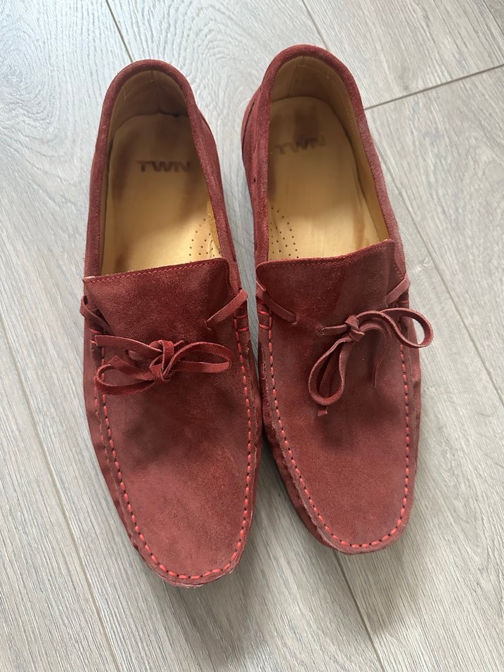 Bordo süet erkek loafer ayakkabılar, parlak yüzey ve tokalı detaylara sahip, romantik akşamlar için uygun. Klasik, desensiz normcore tarzı. Sadece bir kere giyildi D’s damat marka