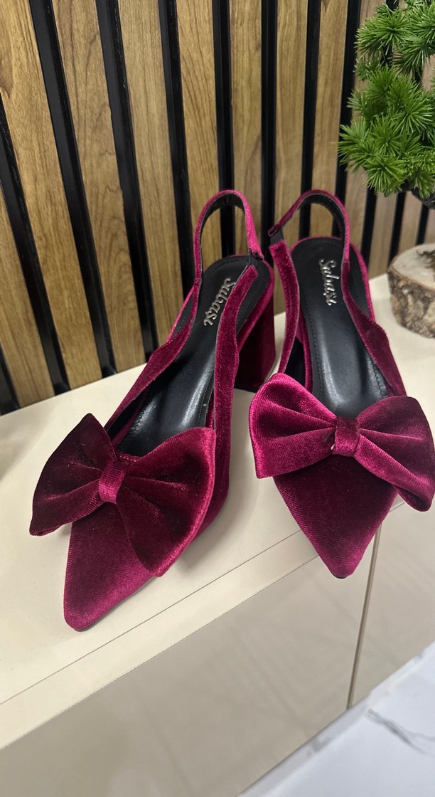 Bordo süet malzemeden yapılan, büyük fiyonk detaylı blok topuklu kadın ayakkabısı, modern klasik ve Paris esintili, romantik akşamlar için ideal.