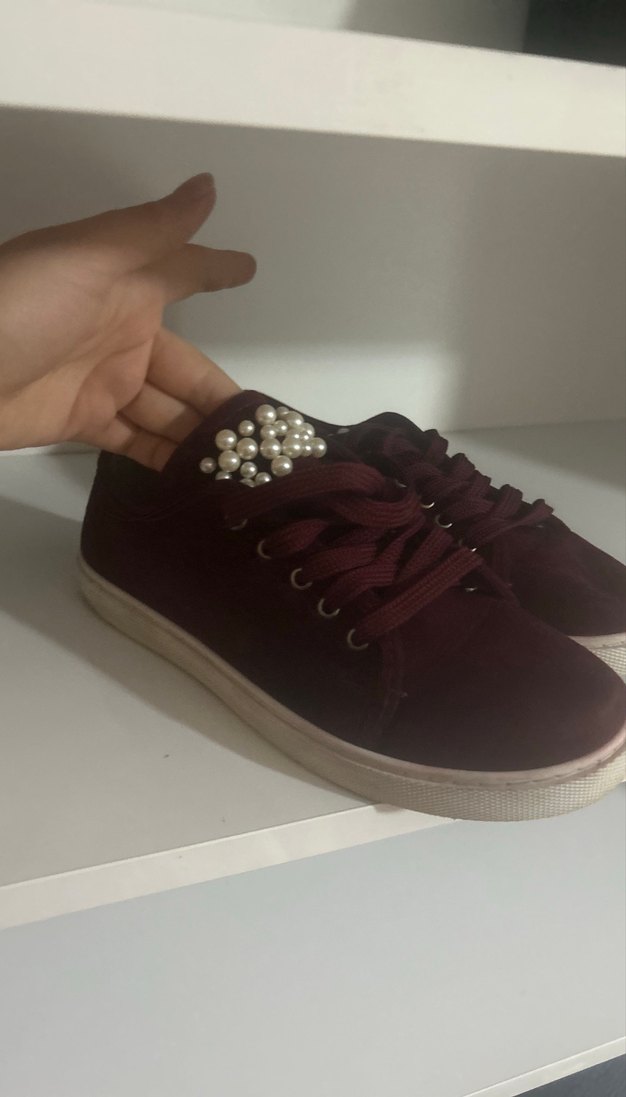 Bordo süet kadın spor ayakkabılar, inci detaylı düğmeli tasarımı ve düz tabanıyla günlük sokak stiline uygundur. Parlak dokusu trend bir görünüm sunar.