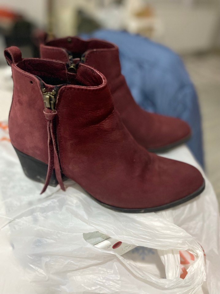 Bordo süet kadın botlar, kalın topuk ve tokalı detaylarla bohem tarzda rahat bir şıklık sunar, günlük kullanım için uygundur. Rahat kalıp 4 cm topuk içi dışı deridir gön marka sayılı kullanıldı iade yoktur