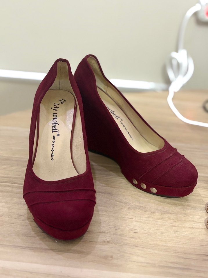 Bordo süet malzemeden üretilmiş, minimalist tasarımlı kadın dolgu topuk ayakkabılar, romantik akşamlar için zahmetsiz şıklık sunar.