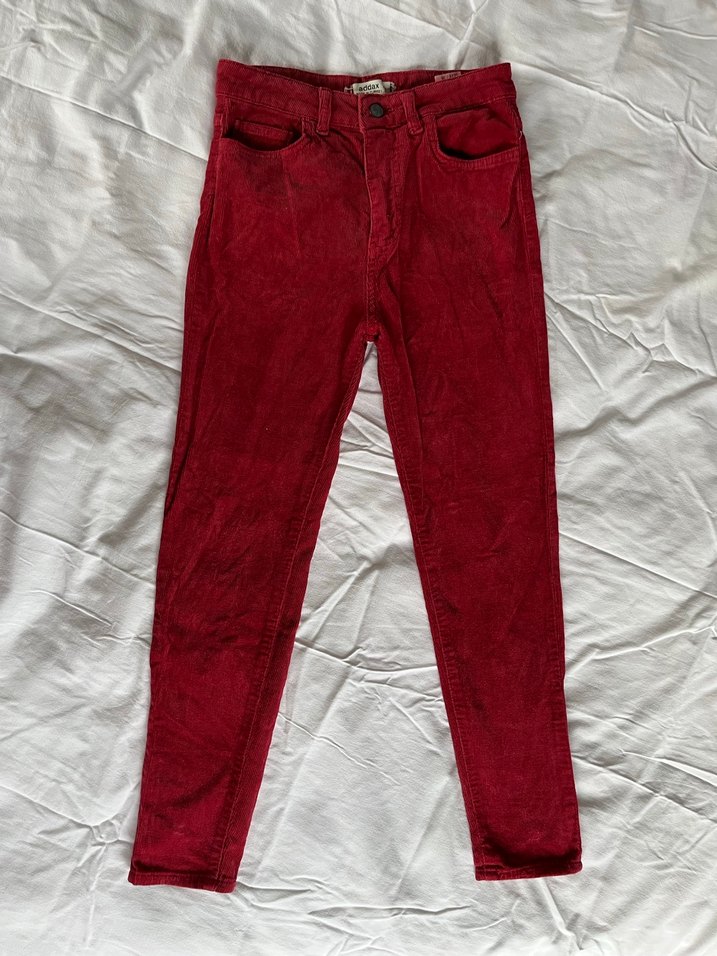 Bordo süet kumaştan, düğmeli kadın pantolon. Rahat ve şık sokak stili için uygundur.