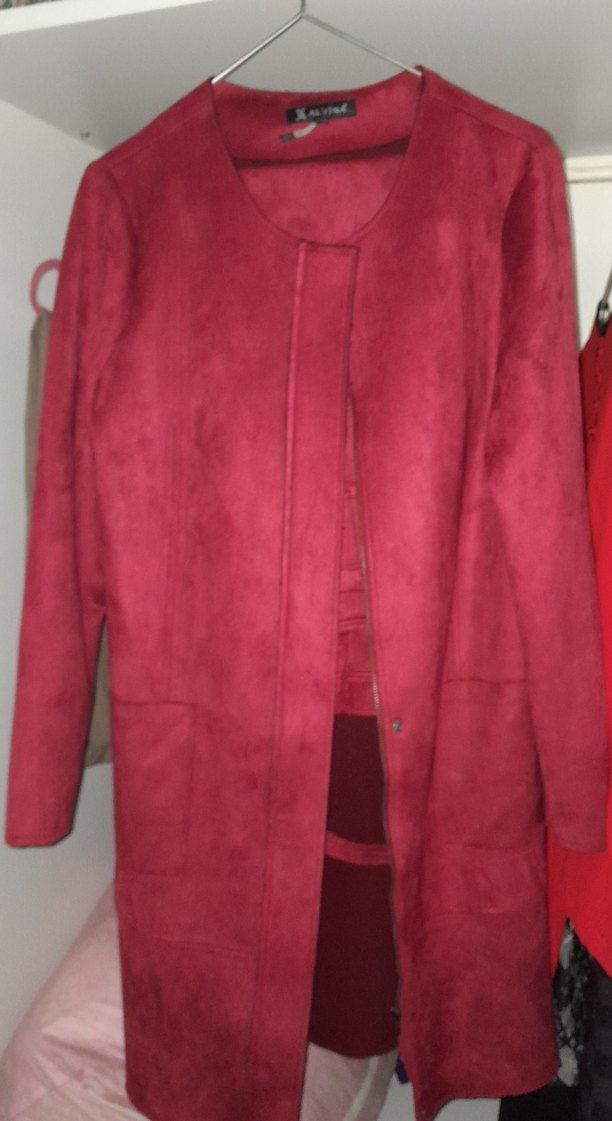 Bordo süet kumaştan, uzun ve regular fit kadın pantolon ceket . Çentikli yaka, uzun kollu ve fermuarlı kapanışlı. Günlük rahat sokak stili için uygundur.