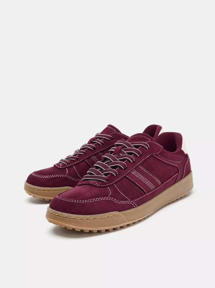 Bordo süet üst yüzeye sahip kadın spor ayakkabıları, günlük kullanım.
