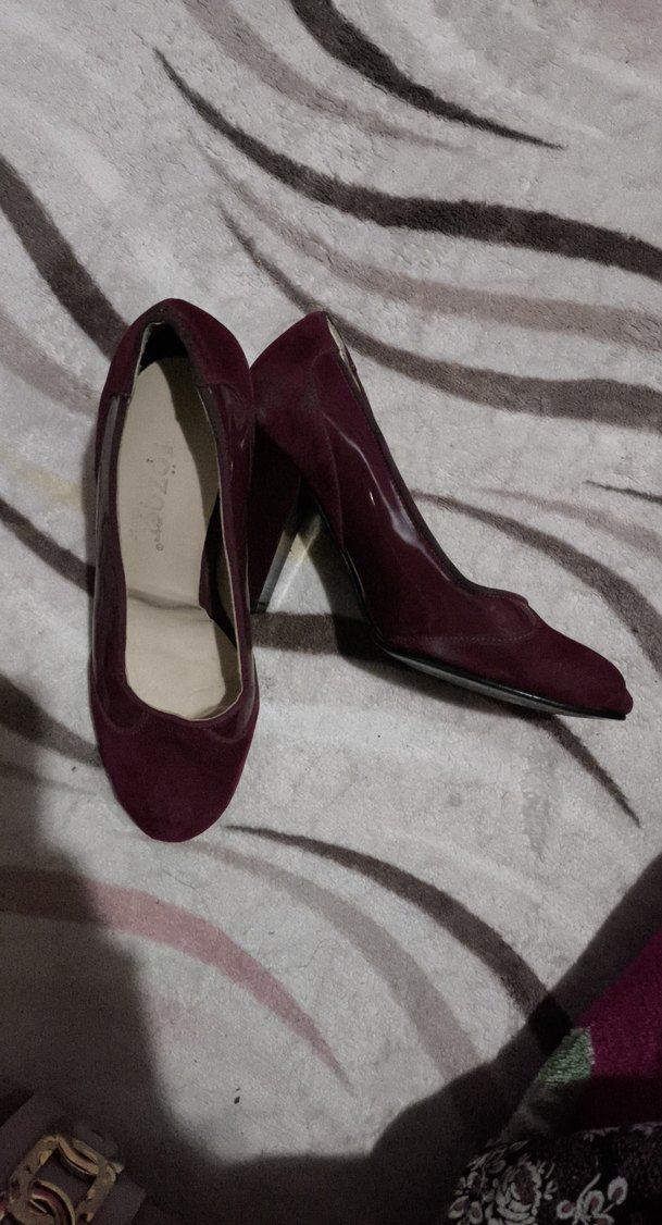 Bordo süet malzemeden yapılmış, blok topuklu kadın stiletto. Klasik ve modern çizgilerle ofis için uygun, desen içermeyen şık tasarım.
