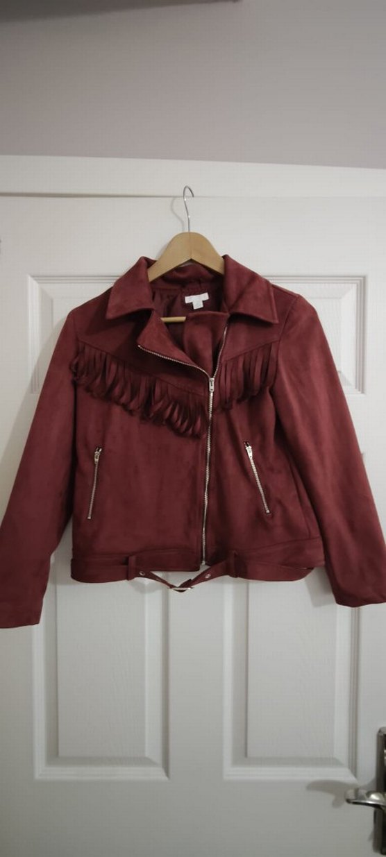 Bordo süet biker ceket, kesik yaka, uzun kollu ve kemerli bel detayına sahiptir. İnce kesim midi boy ve baskılı püskül detaylarıyla dikkat çeker.
