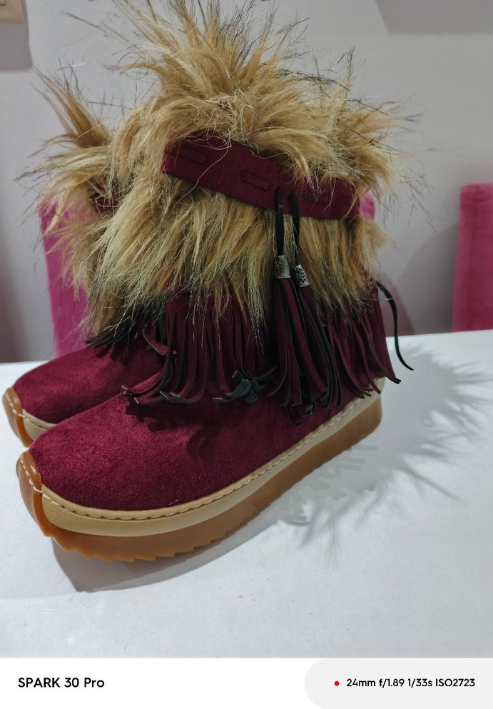 Bordo süet malzemeden yapılmış, kürk detaylı ve dolgu topuklu kadın botları. Bohem ve retro tarzları bir araya getirir.