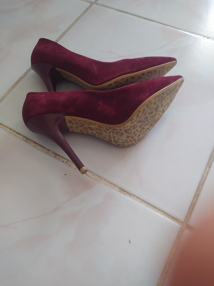 Bordo süet stiletto, leopar desenli taban ve kürk detaylarıyla renkli ve göz alıcı bir görünüm sunar.