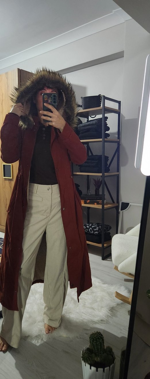 Bordo süet kumaştan, notched yaka ve uzun kollu, rahat kesimli midi boy kadın mont. Kapüşonunda kürk detayıyla günlük kullanıma uygun, sıcak ve rahat bir model.