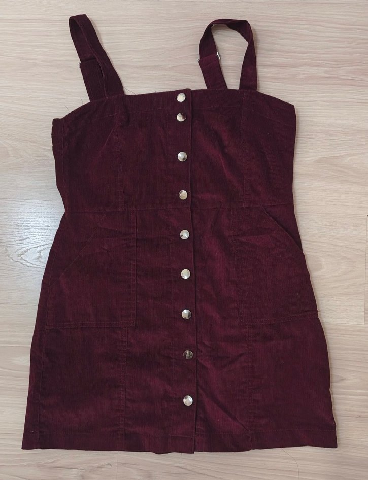 Bordo süet kumaştan, düğmeli, askılı ve midi boyda, kadife kumaş