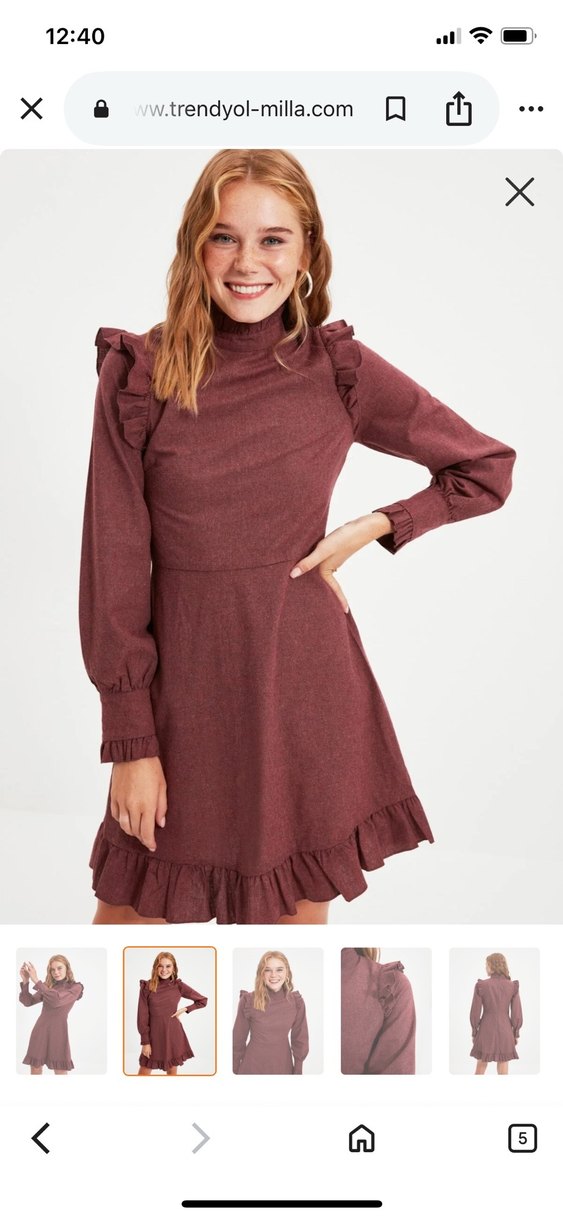 Bordo süet midi elbise, yüksek yaka ve uzun kollu. Fırfır detaylarıyla rahat ve bol kesim, günlük kullanıma uygun sokak tarzı elbise.