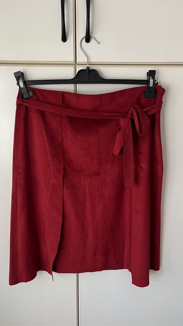Bordo renk, süet kumaştan, kemerli, midi boy, sade ve minimalist bohem tarzda, ofis için uygun, dar kesim eteği.