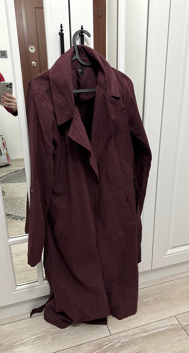 Bordo renkli kumaştan, drapeli ve bol kesimli, kesik yaka ve uzun kollu midi trençkot. Bir sıkıntısı yok artık bedeni olmadığı için satıyorum
