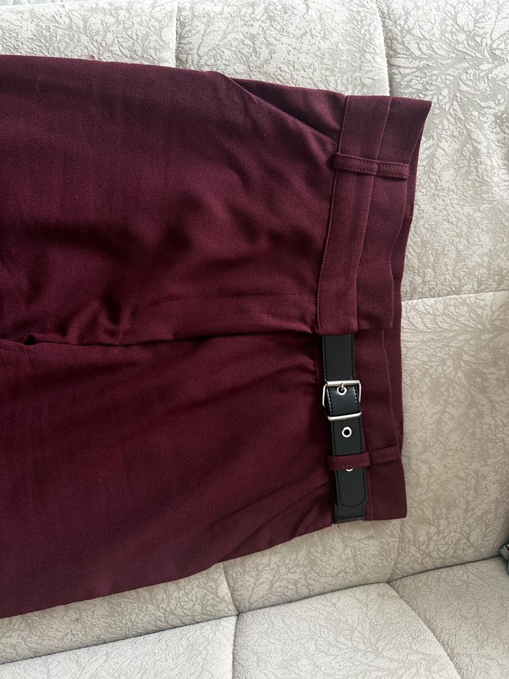 Bordo beli kemer detaylı kumaş pantolon. 161 boy 48 kiloda kullandım. 1 kez giydim m beden beğendiğim için kendime göre yaptırdım ayak kısmına hafif yırtmaç açtırılmıştır.