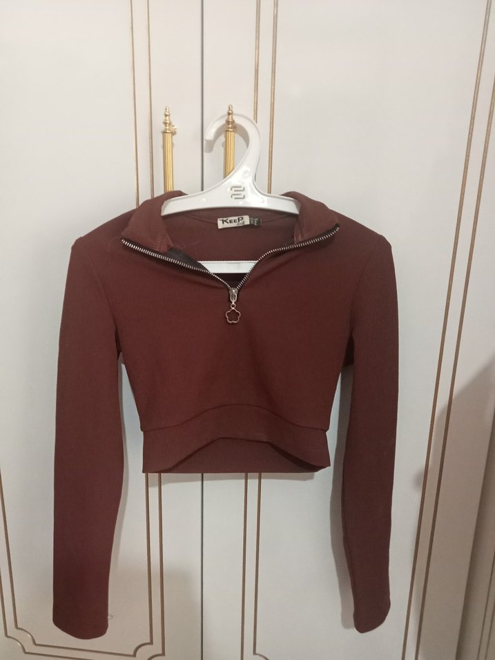 Bordo süet kumaştan, uzun kollu, fermuarlı, yüksek yakalı ve mini boyda, dar kesim sweatshirt. Günlük sokak modasına uygun.
