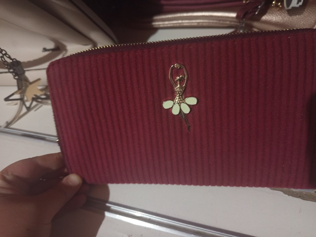 Bordo süet kumaştan fermuarlı, nakış işlemeli kadın portföy cüzdan, klasik şıklık ve günlük sokak stili sunar.