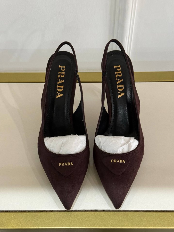 Bordo süet malzemeden yapılmış, tokalı ve baskılı detaylara sahip Prada stiletto topuklu ayakkabı, romantik akşamlar için uygun.