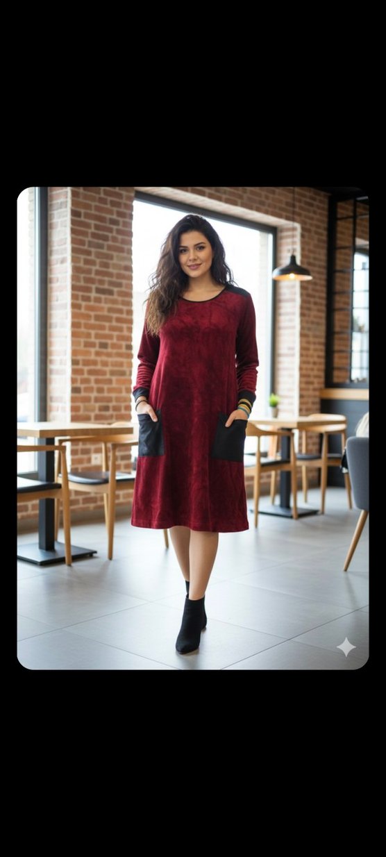 Bordo süet kumaştan, uzun kollu, salaş kesim elbise. Bağlanmış desenli, yuvarlak yaka ve siyah ceplerle rahat ve şık bir görünüm sunar.