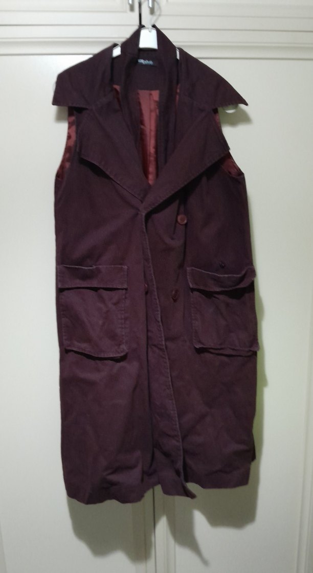 Bordo süet sıfır kol kumaştan yapılmış, düğmeli ve yakalı, bol kesim uzun kollu yelek. Minimalist tarzda, günlük kullanıma uygun.