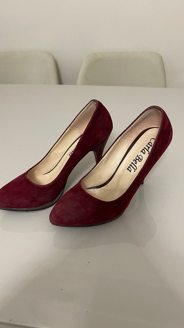 Bordo süet malzemeden, baskılı desenli stiletto topuklu kadın ayakkabı. Modern klasik tarzda, romantik akşamlar için ideal, zahmetsiz şıklık sunar.