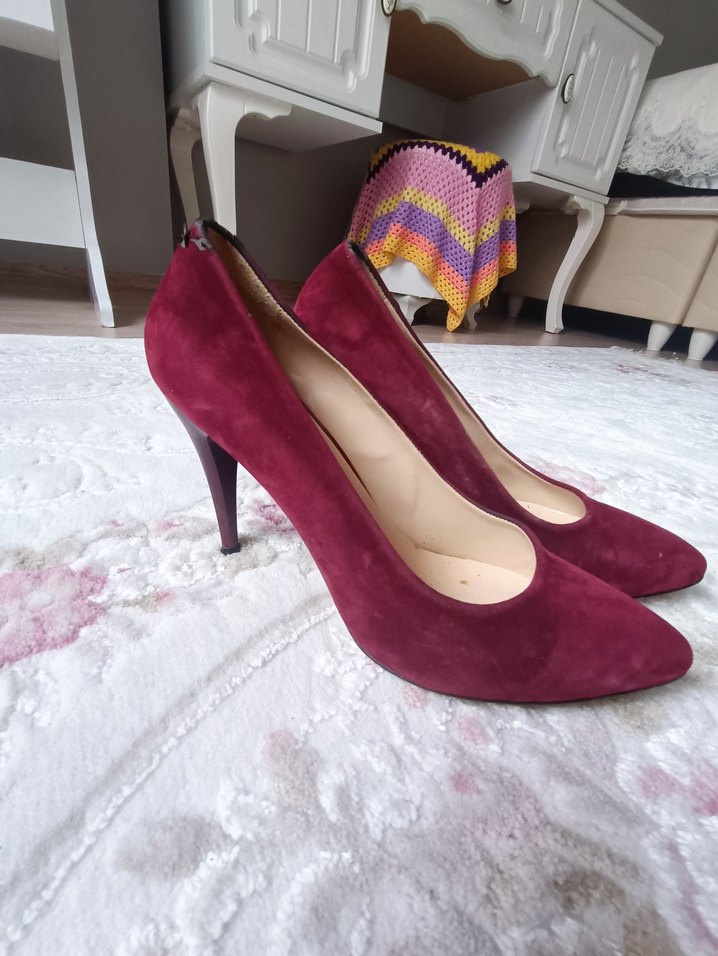 Romantik akşamlar için bordo süet stiletto topuklu ayakkabılar. Koyu renkli, desensiz ve modern klasik tarzda, zahmetsiz şıklık sunar.