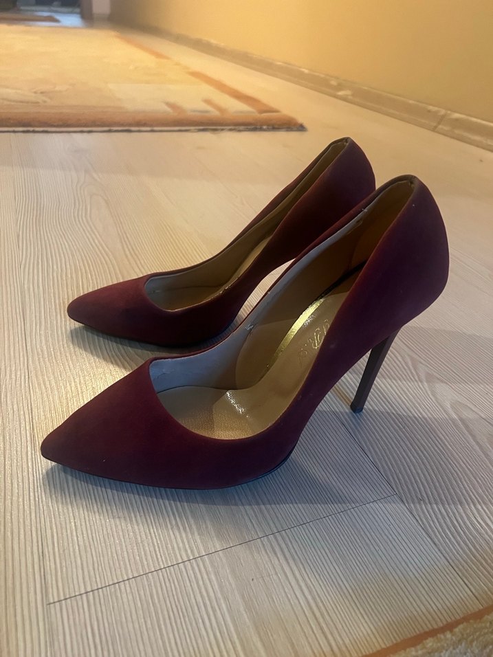 Bordo süet stiletto topuklu ayakkabı, modern klasik tasarımı ve sivri burunuyla romantik akşamlar için şık bir görünüm sunar.