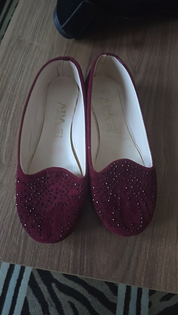 Bordo süet, taş işlemeli ve parlak görünümlü düz taban kadın babet. Minimalist tasarımıyla düğün ve özel günlere uygun.