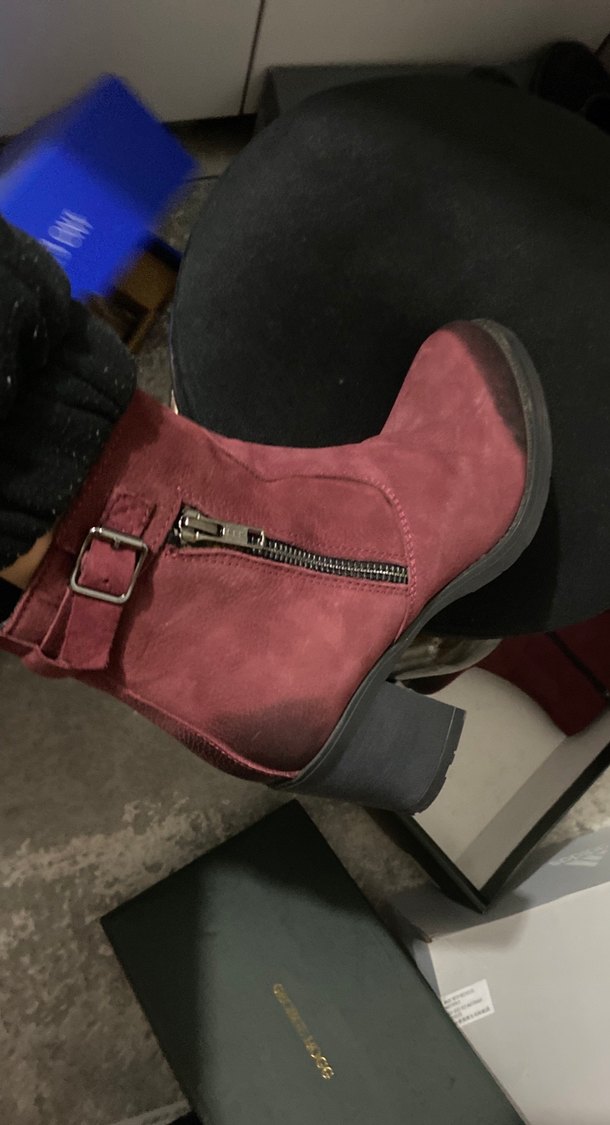 Bordo süet malzemeden üretilmiş, tokalı ve kalın topuklu kadın biker botu, rahat ve şık bir günlük kullanım sunar.
