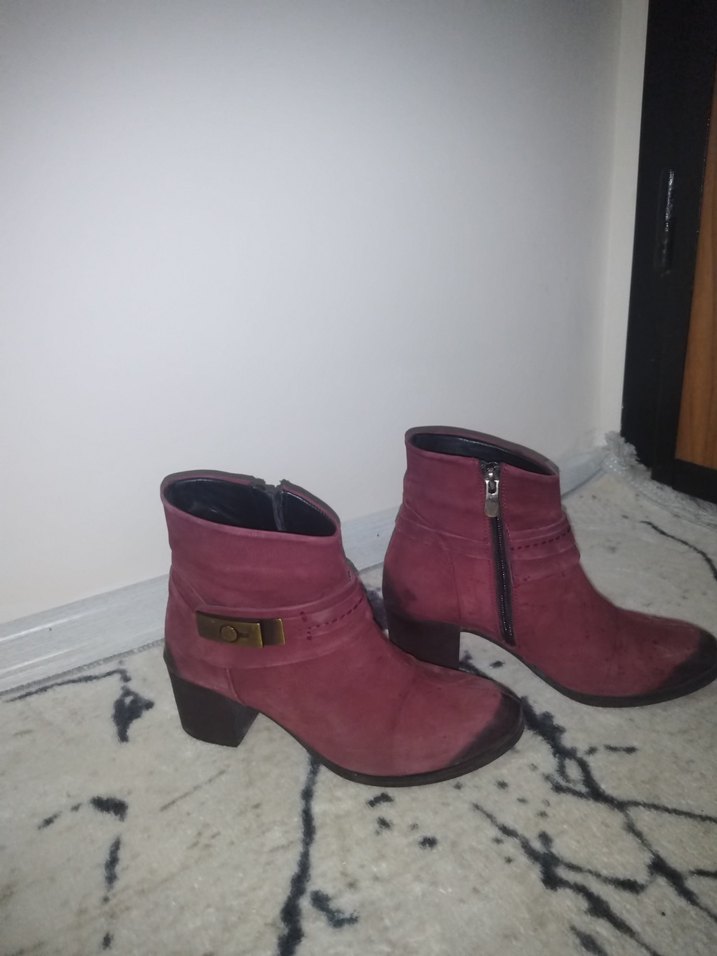 Bordo süet kadın bot, kalın topuklu ve tokalı detaylı, yan fermuar ile kolay kullanım sağlar. Minimalist tarzda günlük kullanıma uygundur.
