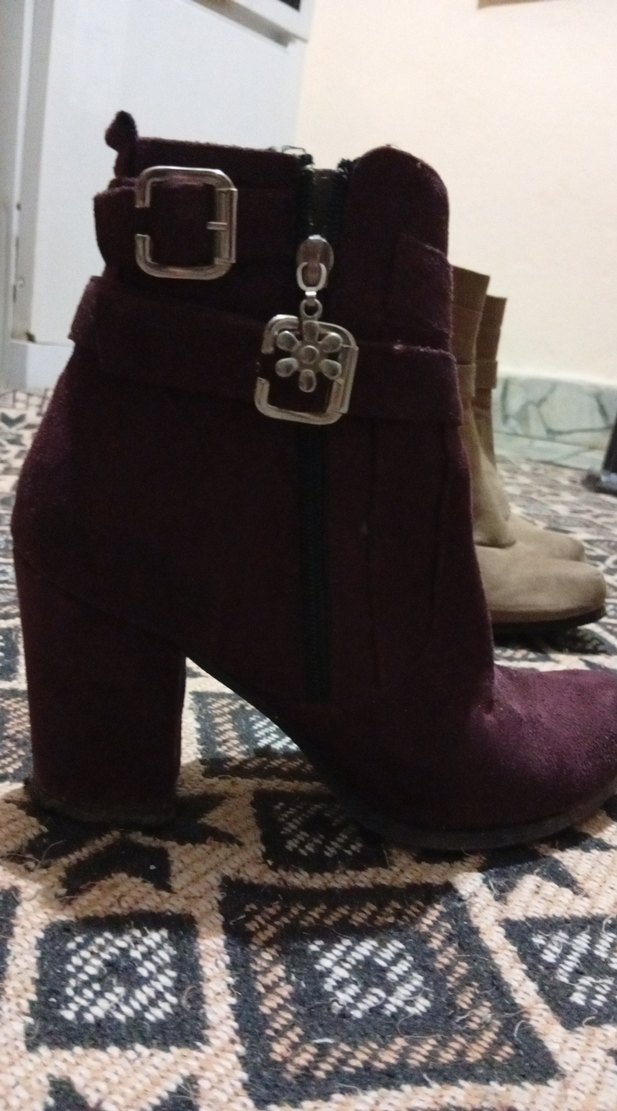 Bordo süet kadın bot, kalın topuklu ve tokalı detaylıdır. Yılan derisi desenli, bohem tarzına uygundur.
