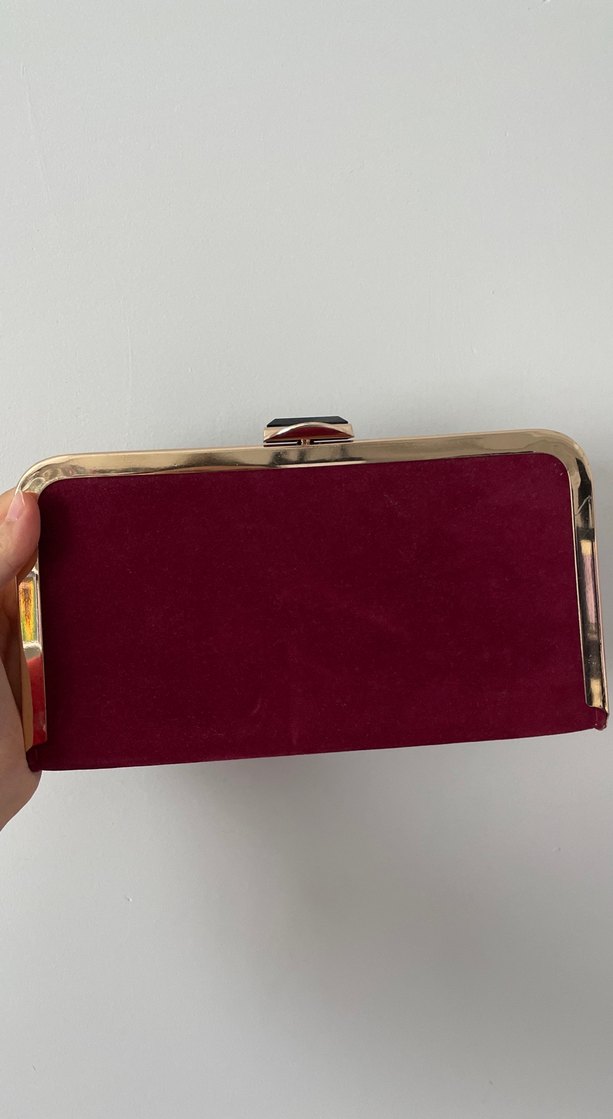 Bordo süet malzemeden yapılmış, tokalı ve altın renk çerçeveli kadın portföy çanta. Minimalist ve modern klasik tarzıyla romantik akşamlar için uygun.