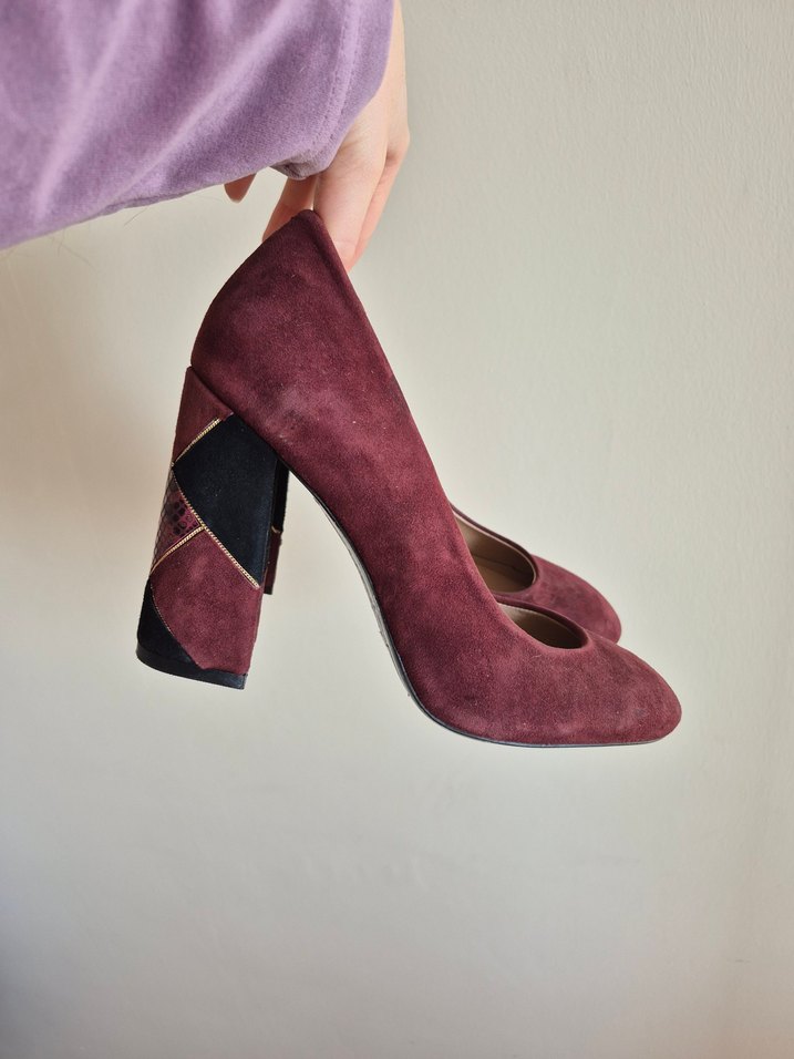Bordo süet stilettolar, tokalı ve desenli kalın topuklu, romantik akşamlar için uygun. Derimod 38 numara Ayakkabının altındaki jelatini duruyor kondisyonu fotoğraflarda mevcut inceleyip alın lütfen 6. fotoğraftaki leke sol ayağın içe bakan tarafıdır