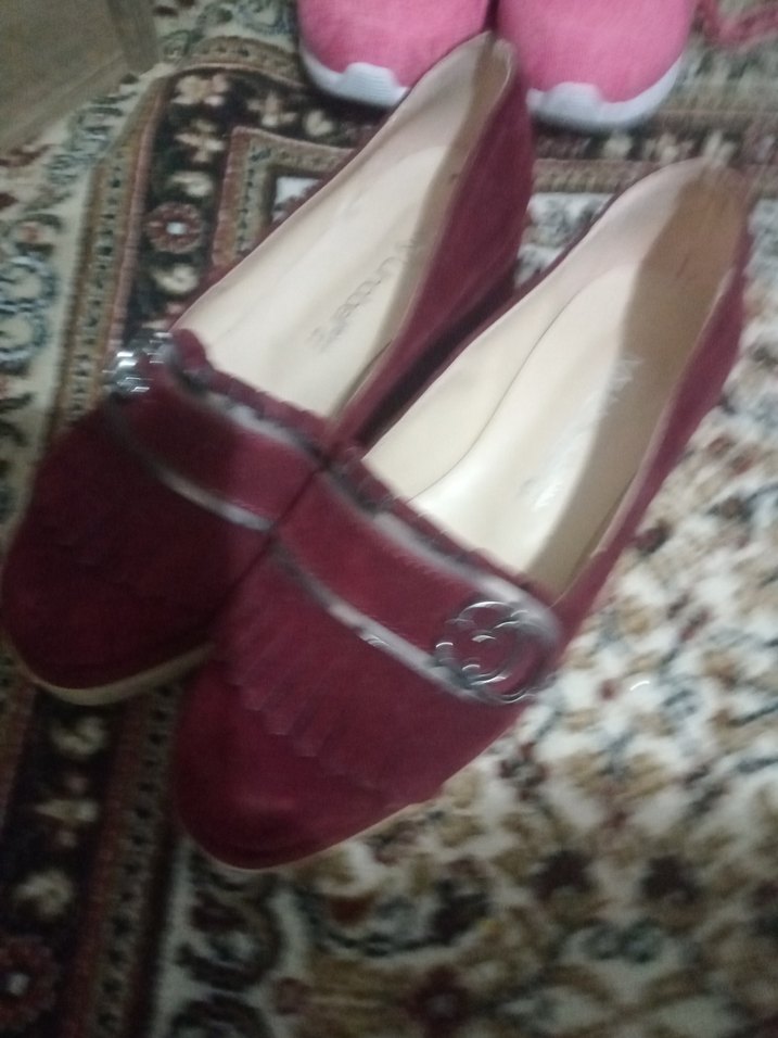 Bordo süet malzemeden yapılmış, parlak yılan desenli ve tokalı, blok topuklu kadın ayakkabısı, günlük kullanıma uygundur.