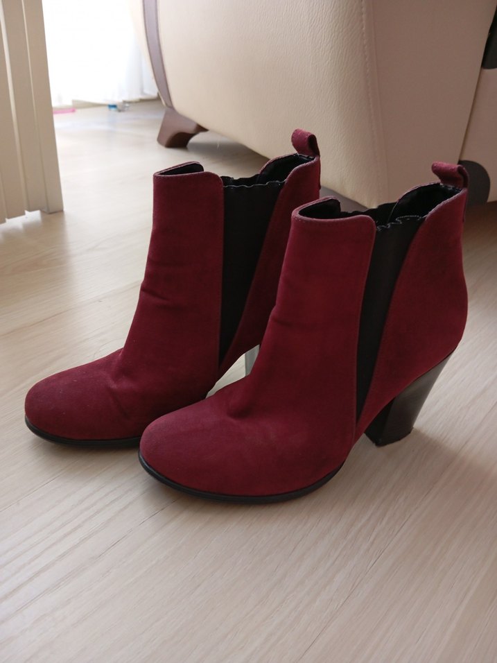 Bordo süet malzemeden, tokalı ve kalın topuklu kadın botu. Cesur gotik tarzıyla günlük kullanıma uygun, koyu ve desensiz tasarım.