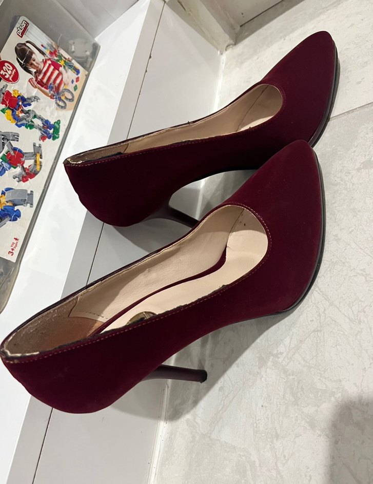 Bordo süet malzemeden yapılmış, tokalı detaylı, sivri burunlu ve yüksek topuklu kadın stiletto ayakkabı. Romantik akşamlar için uygun. Fiyat sorunuz