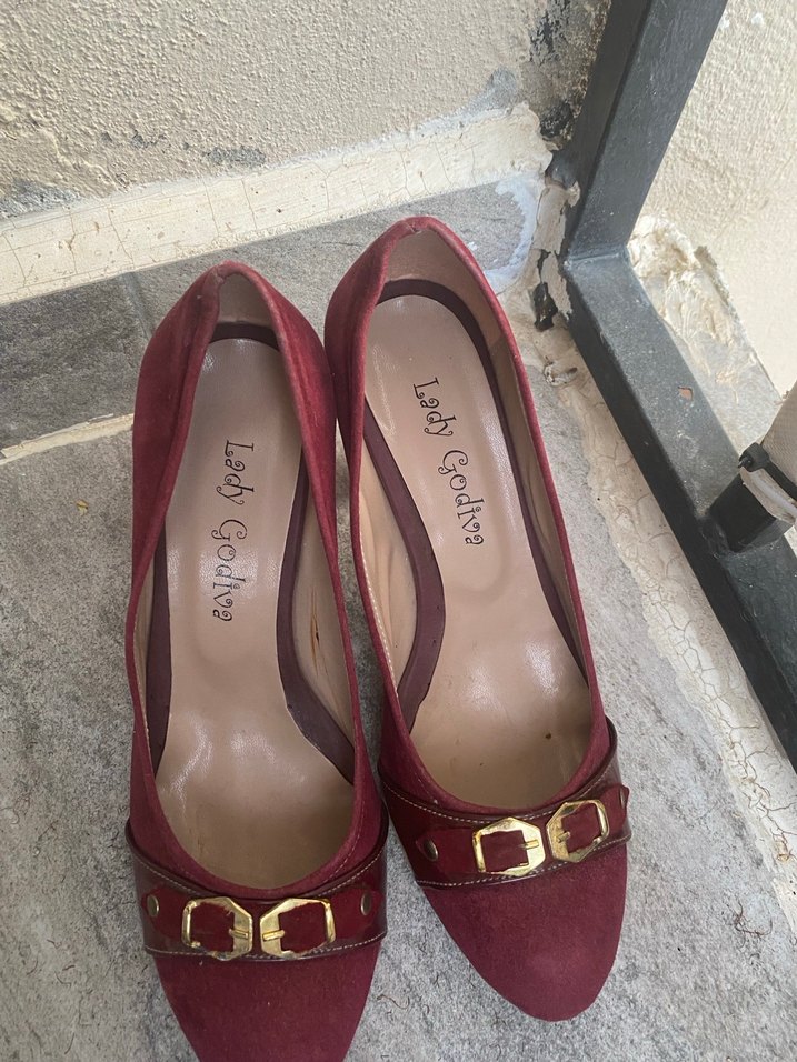 Bordo süet, parlak tokalı yüksek topuklu stiletto. Lady Godiva markalı, romantik akşamlar için bohem tarzda.