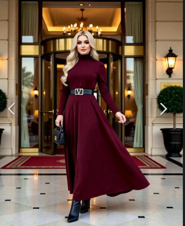 Bordo süet kumaştan, uzun ve kemerli, yüksek yakalı, uzun kollu klasik ve modern kesim elbise. Ofis kullanımı için uygundur. kemer dahil değil