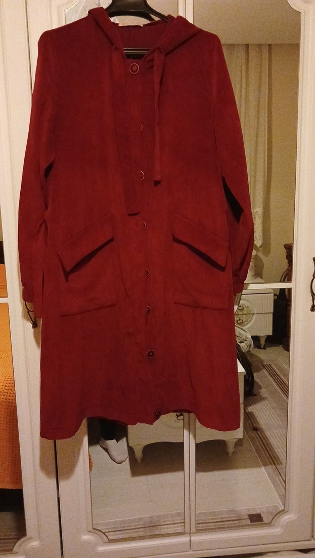 Bordo renkli süet kumaştan yapılmış, düğmeli, uzun kollu, bol kesim hamile kabanı. Notlu yaka ve desen içermeyen sade tasarımıyla günlük kullanım için uygundur.