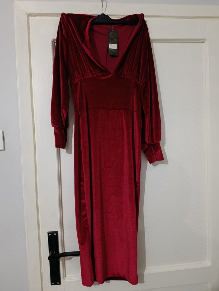 Bordo süet kumaştan, uzun kollu ve V yakalı, drapeli, vintage goth tarzında, klasik ve şık uzun elbise. Romantik geceler için uygundur. ❤️