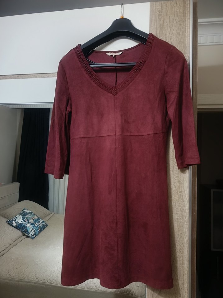 Bordo süet kumaştan, V yaka ve uzun kollu, bol ve drapeli kesime sahip midi boy elbise. Minimalist bohem tarz için uygundur.